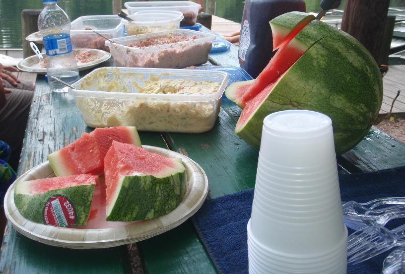 Homemade fried chicken, coleslaw, potato salad, ice tea, and watermelon