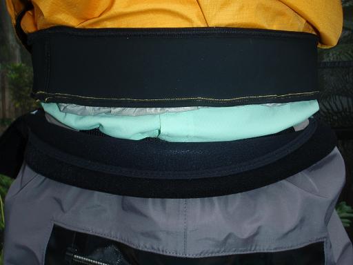 I combined these pants with my discontinued Stohlquist double skirted dry top. I folded the bottom of the inner section of my dry top up. And snugged the waist band of the Kokatat pants on top of the inner section of my dry top. I then pulled my neoprene spray skirt on with the tunnel over the dry top.