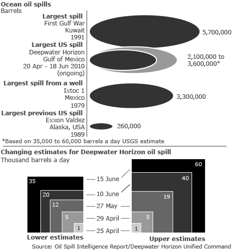 Currently estimates put the leakage at between 35,000 to 60,000 barrels per day, “The oil slick now covers an area of sea the size of Scotland ” http://news.bbc.co.uk/2/hi/world/us_and_canada/10367509.stm BBC News “Gulf of Mexico oil spill claims to be ‘paid quickly'” 15:41 GMT, Monday, 21 June 2010 16:41 UK