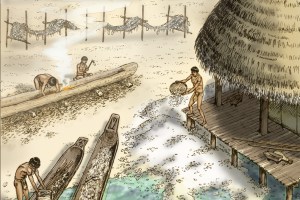 The Calusa Indians made heavy, long canoes out of cypress wood that were equipped with both paddles and sails that they used to fish, gather, and hunt from. The Calusa ate fish such as mullet , crab, conchs, clams, oysters, and lobsters that they would either gather or fish for using nets, weirs (corral type pin ), or bow and arrow and spears with shell heads. The tribe also hunted turtles, eels, birds, and small game with blow guns with darts dipped in poison from sting ray slime. Only 20% of their diet was believed to have consisted of fruits, nuts, berries, and everybody’s favorite……..roots!! Because of the abundant supply of food available they were able to become detailed wood carvers & elaborate mask makers, as well as build artificial islands, docks, seawalls out of – yep you guessed it – SHELLS!! There have been many items found, made by the Calusa using seashells and sharkteeth – such as tools for survival and living, weapons, utensils, jewelry, and mask & temple ornaments! I wonder if that has any reasoning for why the Calusa were called the SHELL INDIANS (ya think)??