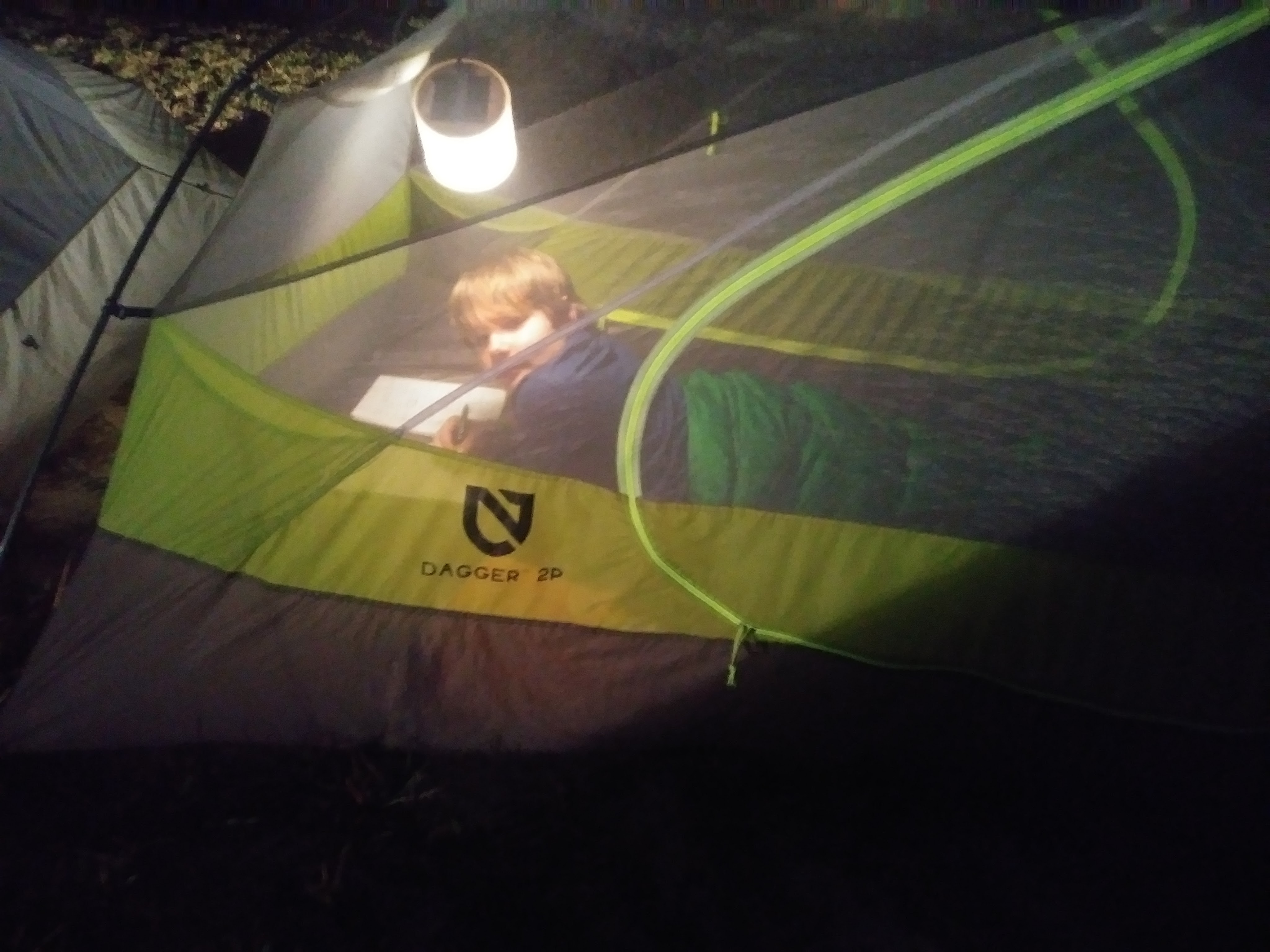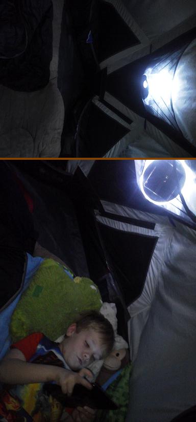 So far we have found the Luci lantern easily lights up my Mountain Hardwear Skylight tent. I normally use a Black Diamond Orbit Lantern. The Orbit at it’s maxim setting emits 45 lumens. It is also is 3 ounces with 4 AAA batteries. Luci is an ounce heaver; she does not require batteries and nearly doubles the amount of light. My son and I found it very easy to share the light reading stories and playing his favorite card game Nuts. Hands down Luci beats the Orbit.