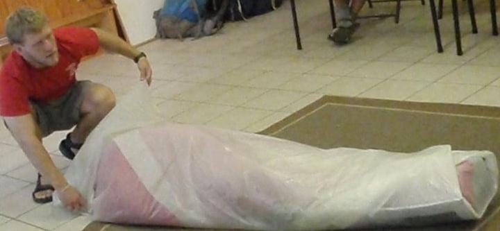 Shelter without tying downs: In an emergency a tarp could make the difference between surviving and dieing. make an emergency bivy sack to protect a person from exposure or hypothermia to keep in body heat. A first responder possibly would use this to transport an injured person out of the wilderness on a stretcher to give added protection to rain or falling snow. The key to making this easy shelter is placement. Lay the tarp 90′ to the wind, and have the opening of your sleeping bag downwind. Fold the tarp over the bag at an angle and giving yourself at least 6 inches of clearance to move around under the tarp.