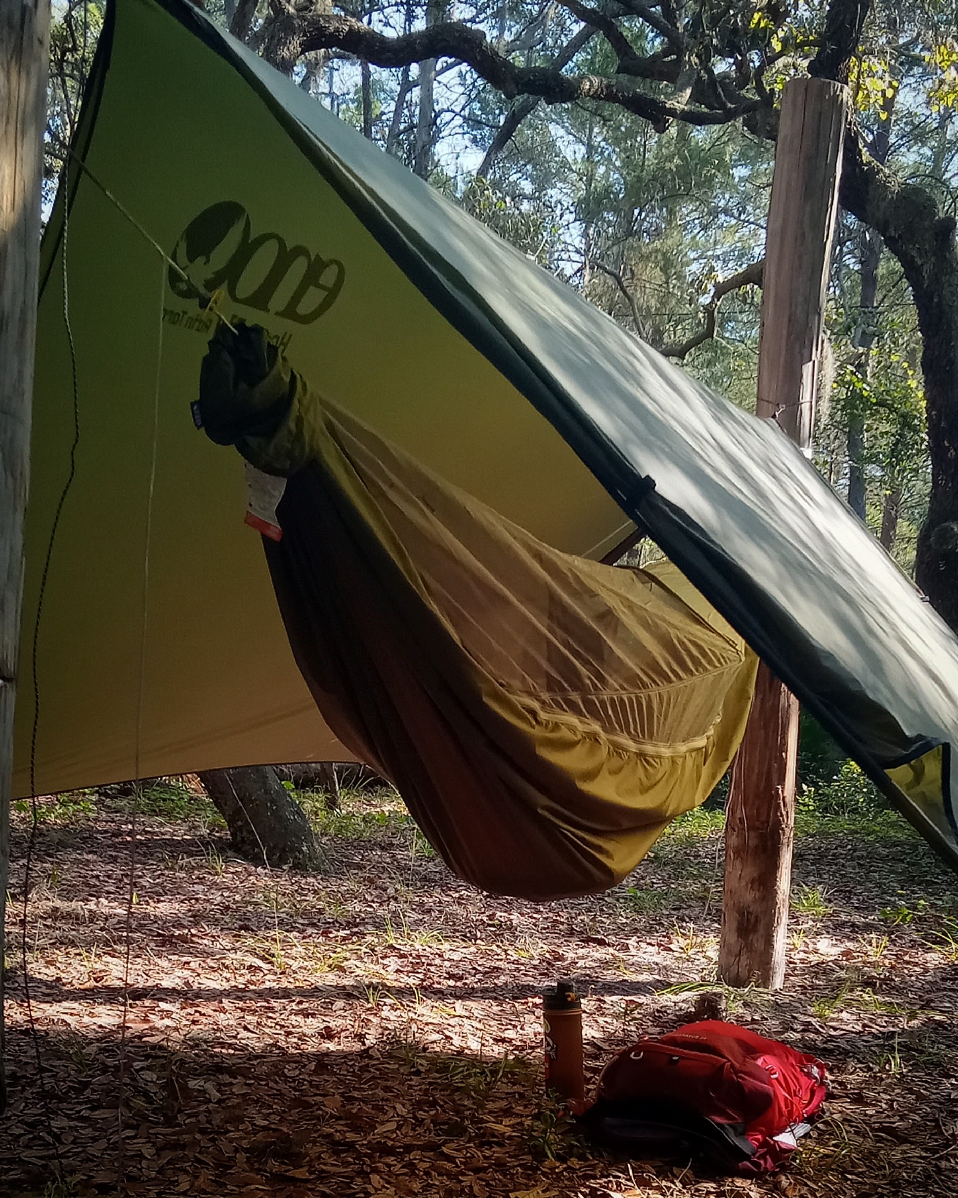 In many ways to the onlooker it looks like we are topless. We still set up the tarp over the hammock with bug net; and adjust it in a way that it is not directly over the top of the hammock to allow for quick deployment over the sleep system if we get a surprise midnight Florida shower. This is simply done by folding the tarp on to itself. In addition to the tarp being arranged in a way to not restrict air flow and our view to the stars.
